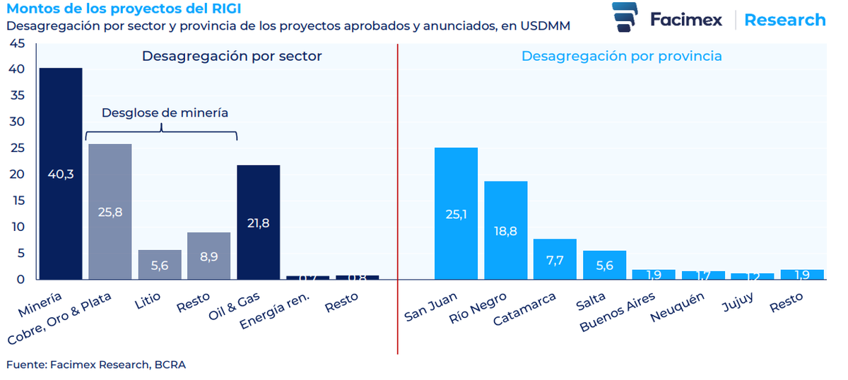 Tal como destaca Facimex, la distribución sectorial muestra con claridad hacia dónde está apuntando el grueso de las inversiones. Minería y Oil & Gas concentran prácticamente todo el universo del régimen, al punto de explicar el 98% del monto total aprobado y anunciado. Dentro de ese mapa, Minería reúne US$40.300 millones, equivalentes al 63% del total, mientras que Oil & Gas suma US$21.800 millones, es decir otro 34%.