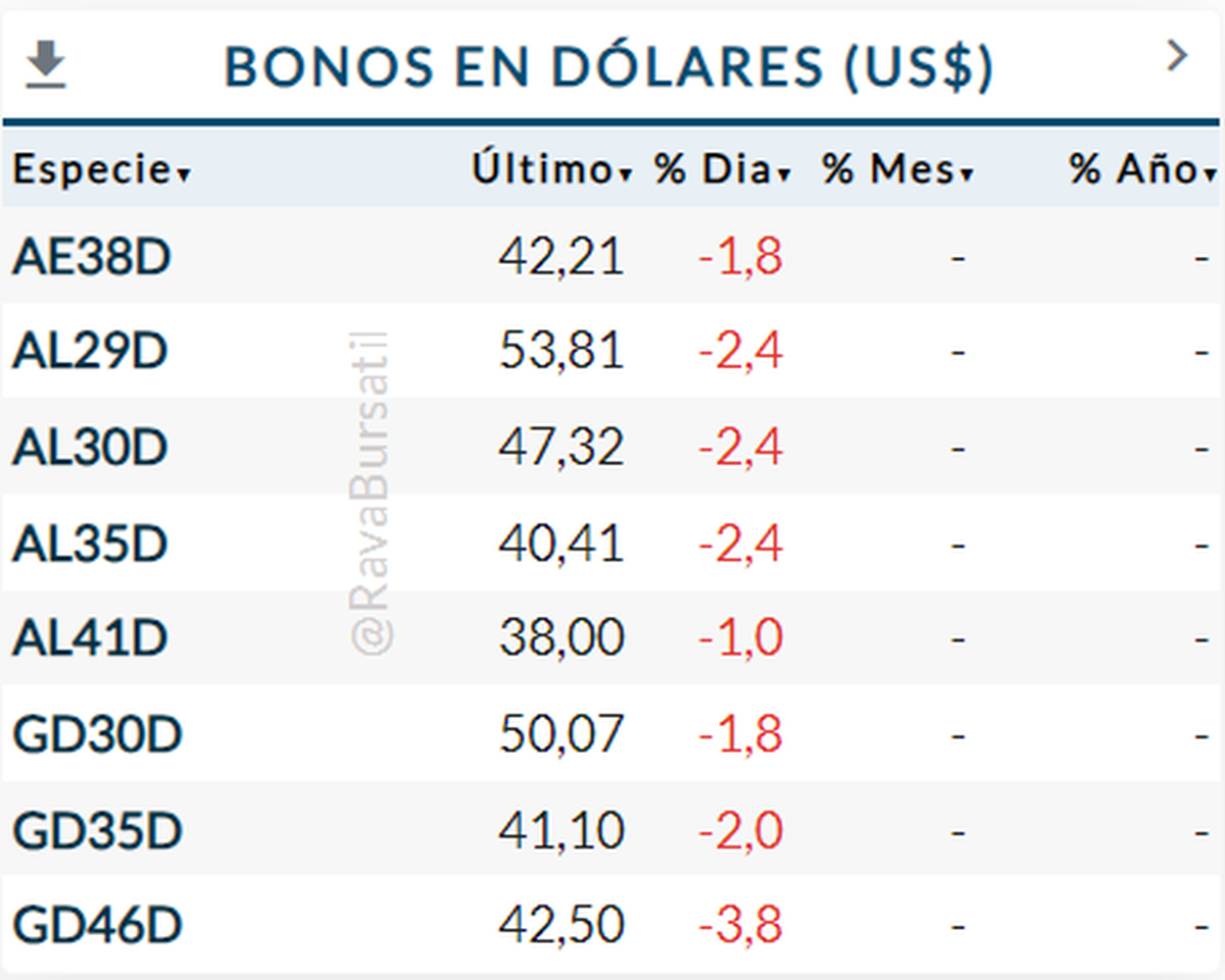Los bonos en dólares son los que más sufren en la jornada, llegando a presenciar caídas de hasta el 3,8%.