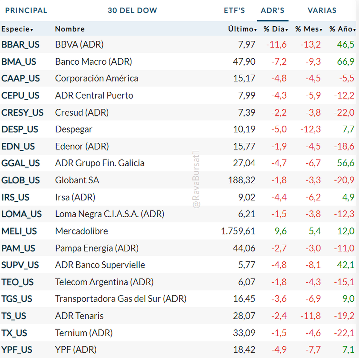 En Wall Street, la acción que protagonizó el único ascenso de la jornada fue Mercadolibre y lo hizo con un 9,6%, mientras que la mayor baja se la lleva Macro al descender un 8,4%. Cabe mencionar que la tendencia en la jornada fue completamente negativa.