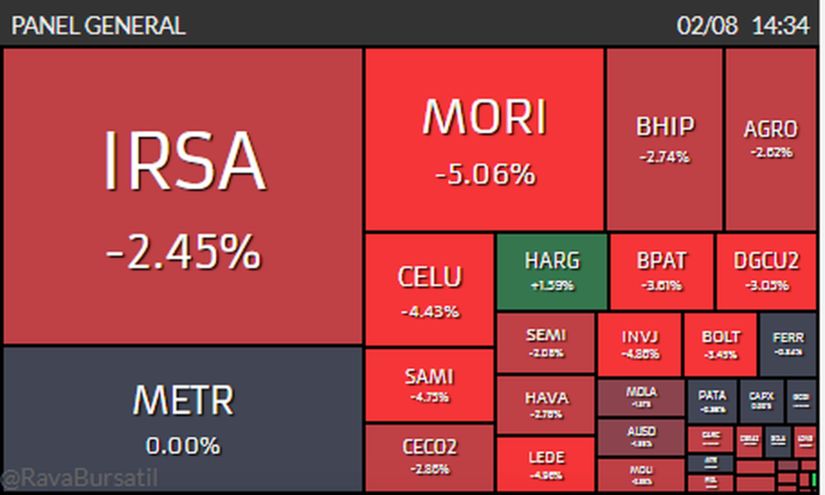 Por el lado del panel general, la historia no es muy distinta, presenta bajas más pronunciadas y las únicas acciones que se salvan son IRSA y LEDE