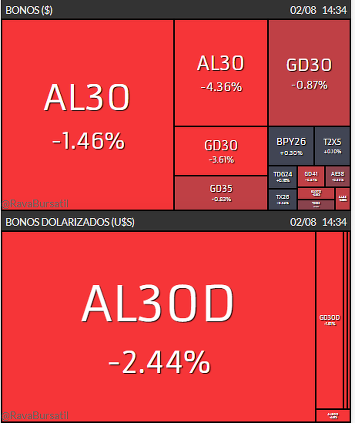 En tanto, el Merval registra una fuerte disminución tanto en pesos como en dólares. Por su parte, los bonos en dólares también presentan caídas considerables, a diferencia de los principales dólares financieros -dólar MEP (o bolsa) y CCL (Contado Con Liquidación)- que suben.