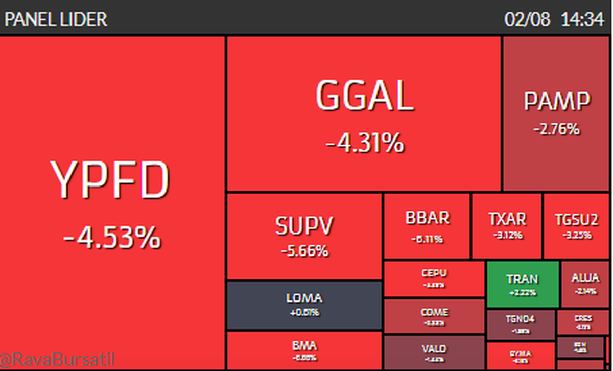 Volviendo al ámbito local, el S&P Merval registra una caída del 3,5% a 1.447.619,49 puntos, mientras que, en dólares, se desploma un 4% a US$ 1.105,51.