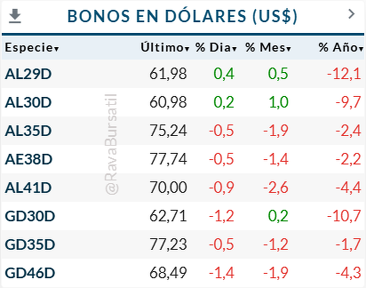 En renta fija, los bonos en dólares operan sin una dirección única. Los títulos de legislación local muestran una rueda algo más firme en el tramo corto. AL29D sube 0,4% y AL30D mejora 0,2%, mientras AL35D cae 0,5% y AL41D retrocede 0,9%. En la curva bajo ley extranjera, el comportamiento también es heterogéneo. GD30D baja 1,2%, GD35D pierde 0,5% y GD46D cae 1,4%.