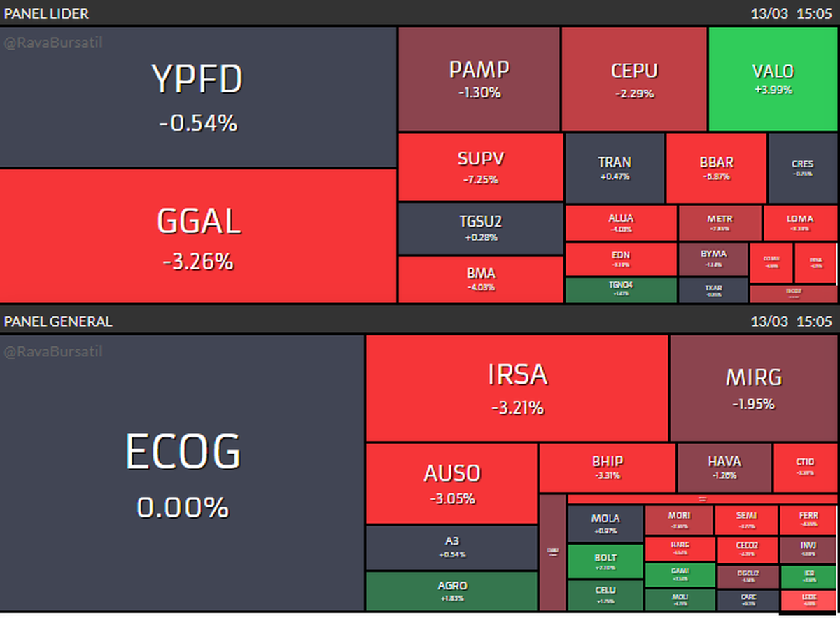 La rueda de este viernes (13/3) muestra un tablero dividido, con las acciones argentinas mayormente en rojo tanto en la plaza local como en Wall Street, mientras los bonos soberanos en dólares exhiben movimientos mixtos y los tipos de cambio financieros se mantienen relativamente estables. En ese marco, el dato que sobresale es que el riesgo país se ubica en 577 puntos, con una suba diaria de 1,6%, aunque todavía por debajo del umbral de 600 puntos, una referencia que el mercado sigue de cerca.