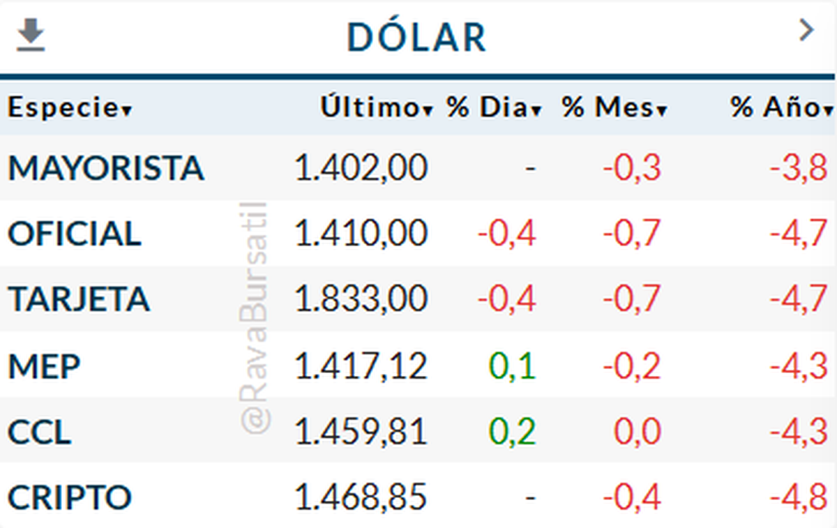Mientras las acciones corrigen y los bonos no terminan de afirmarse, el frente cambiario ofrece una imagen bastante más ordenada. El dólar mayorista se ubica en $1.402, con una baja mensual de 0,3%, mientras el oficial cotiza en $1.410. En los financieros, el MEP opera en $1.417,12 con una suba diaria de 0,1%, y el CCL se mueve en $1.459,81, también con un alza acotada de 0,2%.