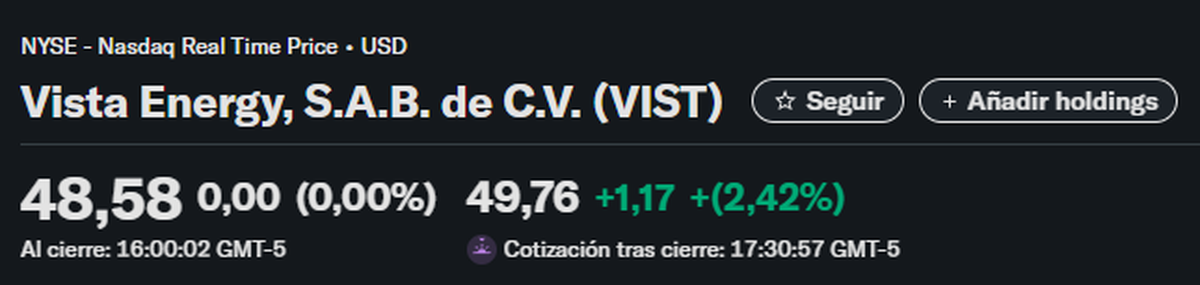 Con una capitalización bursátil de US$5.010 millones y un precio actual de US$49,76, Vista mantiene un potencial de suba del 53% hasta el objetivo de US$76 definido por Allaria.