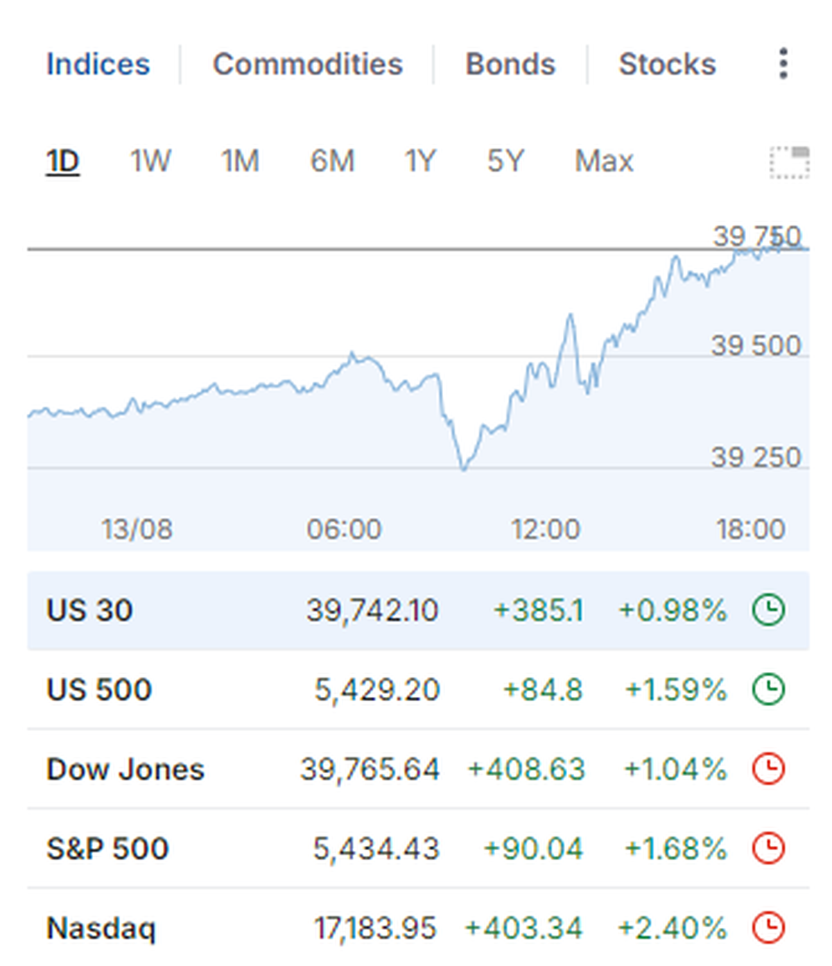 Wall Street cerró al alza este martes (13/8), alcanzando su mayor nivel en casi dos semanas, impulsados por, de acuerdo con Reutes, datos que sugieren una desaceleración en los precios al productor, lo que avivó las expectativas de un recorte en las tasas de interés por parte de la Reserva Federal (Fed) el próximo 18 de septiembre.