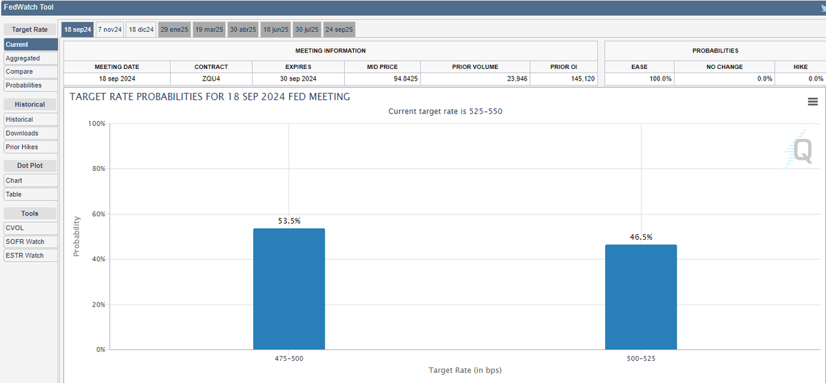 Las expectativas de un recorte de 50 puntos básicos en la tasa de interés por parte de la Fed se incrementaron al 53,5% luego del informe del IPP, en comparación con menos del 50% antes de su divulgación, según la herramienta FedWatch de CME.