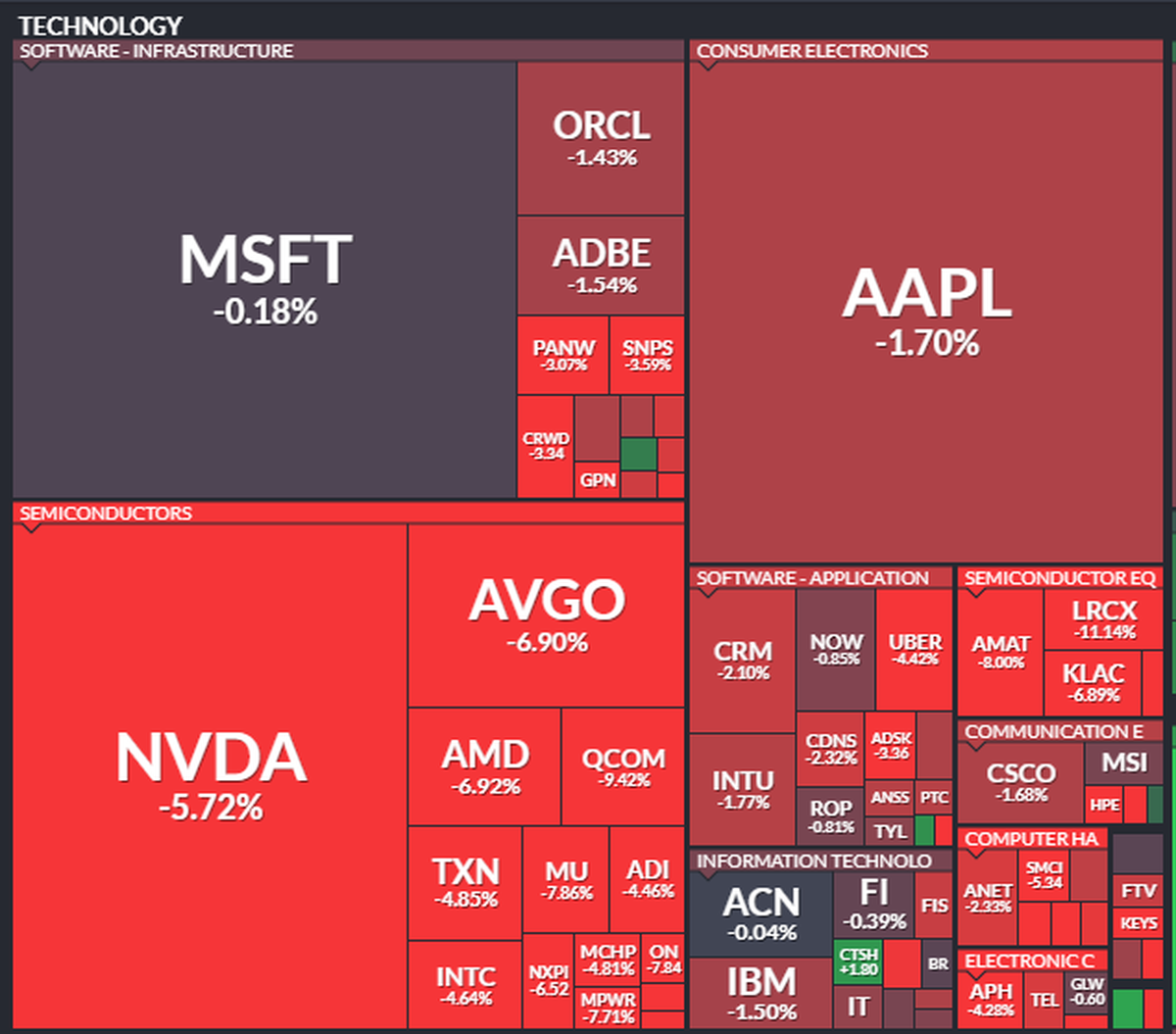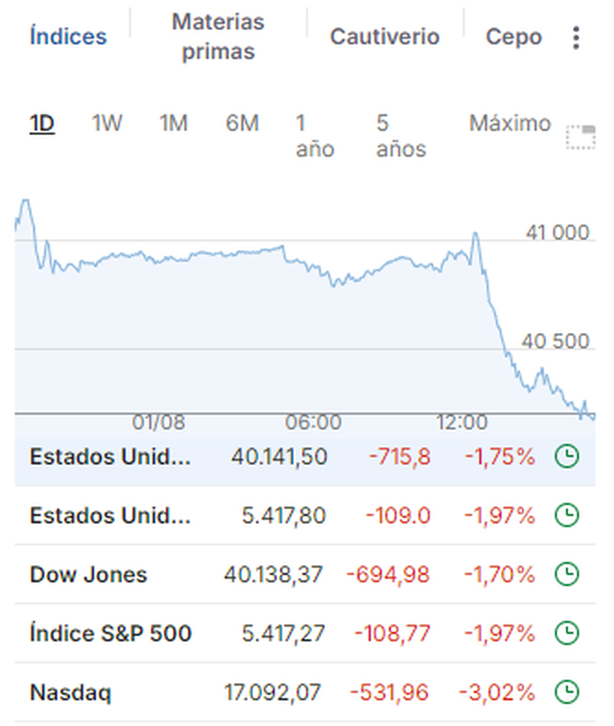 Los principales índices de Wall Street se encuentran en fuerte terreno negativo este jueves (1/8), con las acciones tecnológicas de gran capitalización y del sector de semiconductores encabezando un desplome que volvió a encender las alarmas sobre el estado de la economía estadounidense.