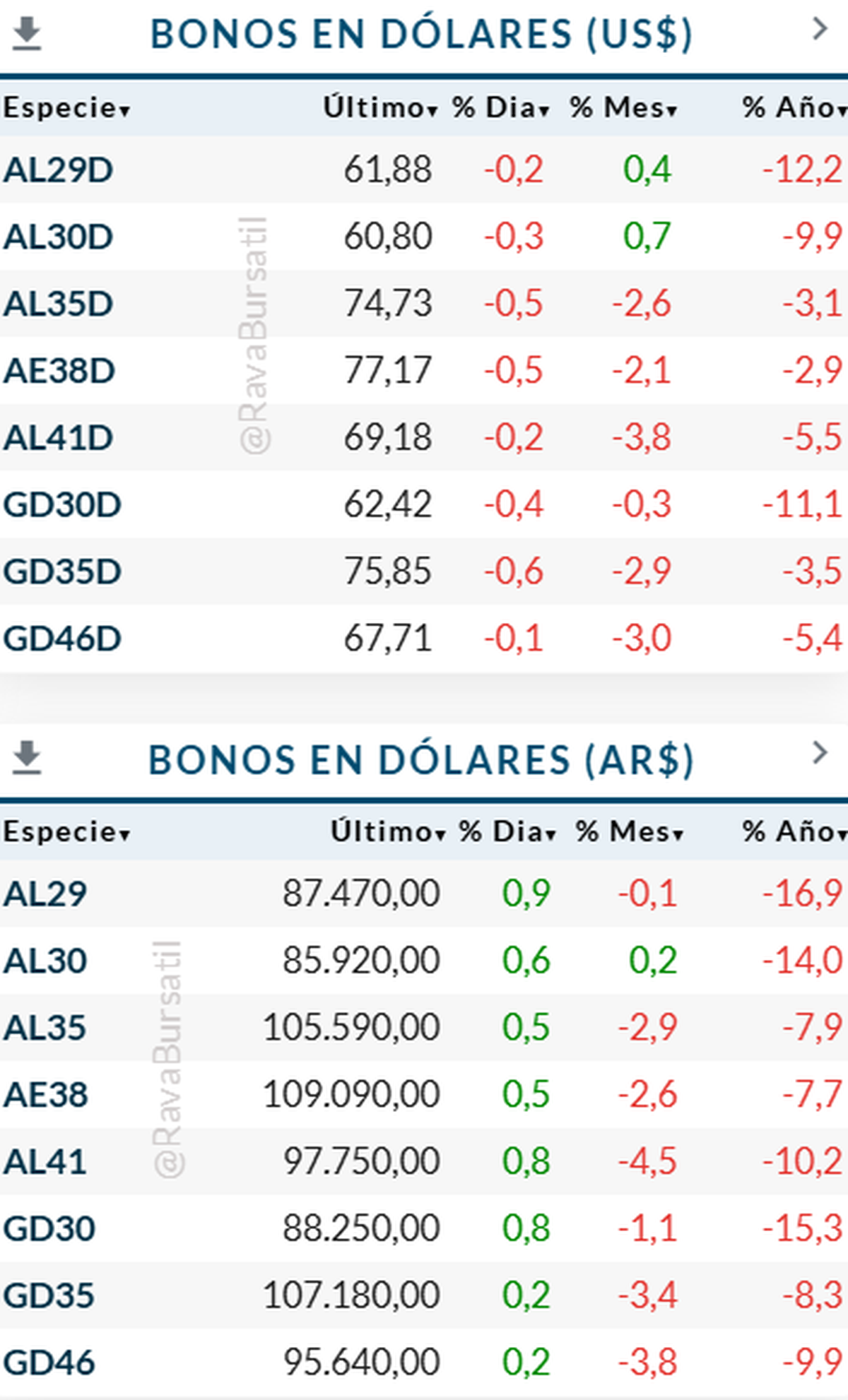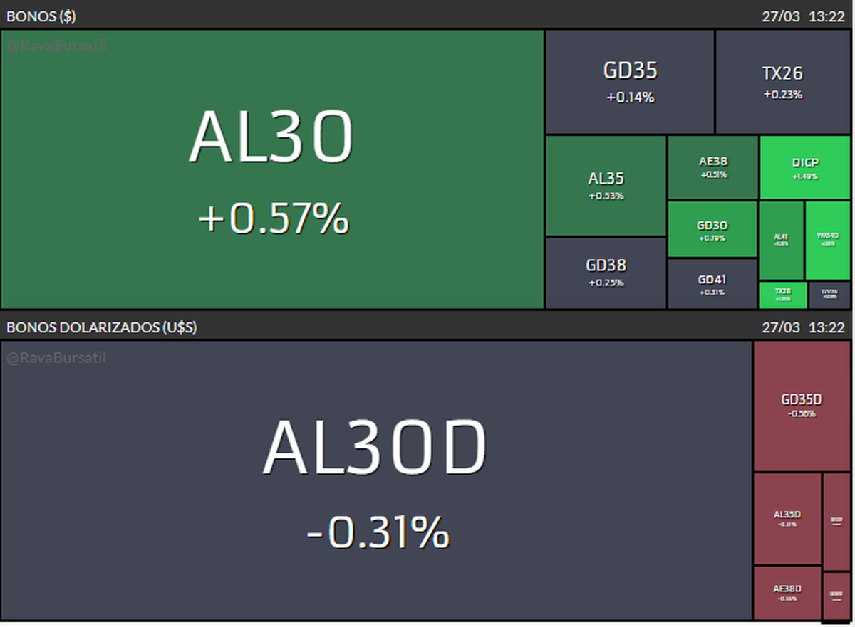 En la plaza local, en cambio, los bonos en pesos ofrecían una rueda algo más firme, porque AL29 subía 0,9%, AL30 mejoraba 0,6%, AL35 avanzaba 0,5%, AE38 trepaba 0,5%, AL41 sumaba 0,8%, GD30 ganaba 0,8%, GD35 mejoraba 0,2% y GD46 también avanzaba 0,2%, una diferencia entre especies que el mercado suele mirar con atención, ya que muchas veces funciona como una señal de que el entusiasmo existe, pero todavía no se traduce en una compresión más contundente del riesgo soberano en moneda dura.