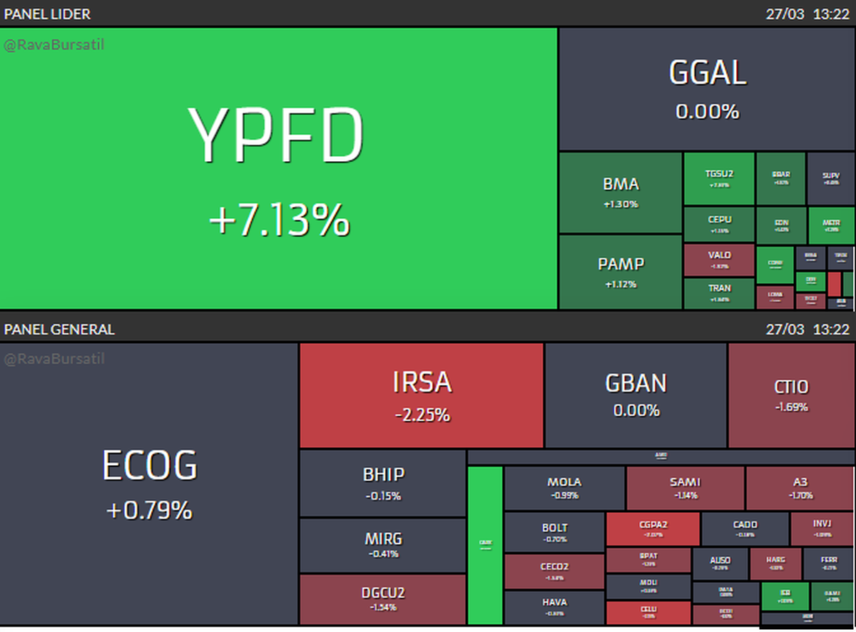 El mercado argentino encontró este viernes (27/3) un sostén contundente en YPF, que a media rueda avanzaba 7,1% en la plaza local y 6,7% en Nueva York, y se transformaba en el principal motor de una jornada en la que el S&P Merval subía 1,9% en pesos y 1% en dólares, aun cuando el clima externo seguía mostrando una tónica mucho menos favorable y la pantalla de Wall Street permanecía dominada por bajas en varios de sus sectores más relevantes.