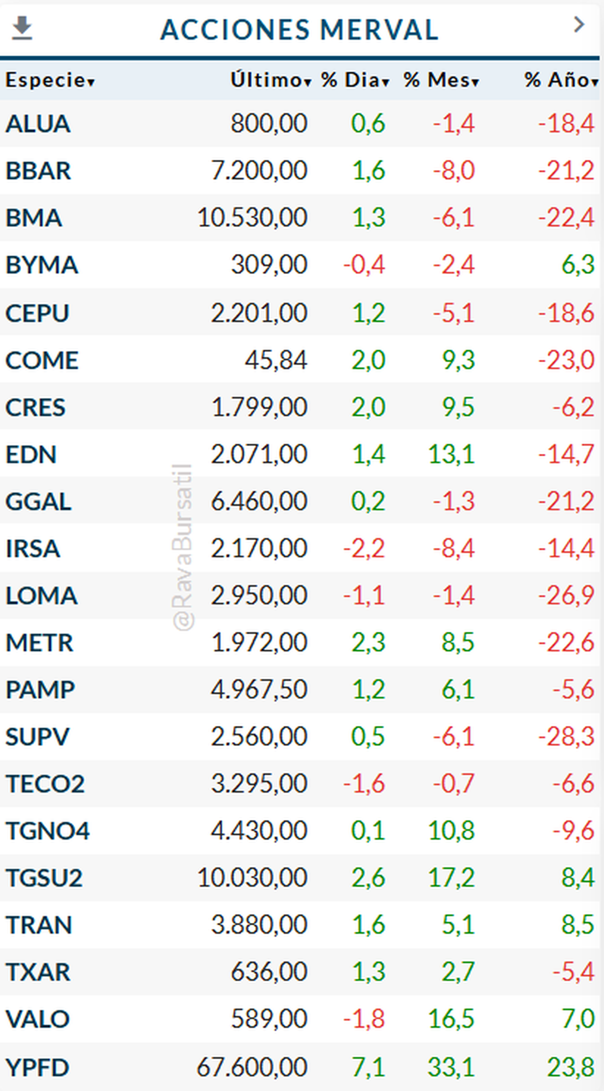 Si la comparación se traslada al mes, las diferencias internas del panel líder se vuelven todavía más evidentes, porque YPF acumulaba una suba de 33,1%, TGS trepaba 17,2%, Valo avanzaba 16,5%, Edenor mejoraba 13,1% y TGNO4 ganaba 10,8%, mientras que, del otro lado, BBAR retrocedía 8%, IRSA caía 8,4%, BMA perdía 6,1% y Supervielle también retrocedía 6,1%, una foto que confirma que el repunte del índice convive con rezagos muy marcados y que el mercado todavía se mueve con una lógica claramente selectiva.