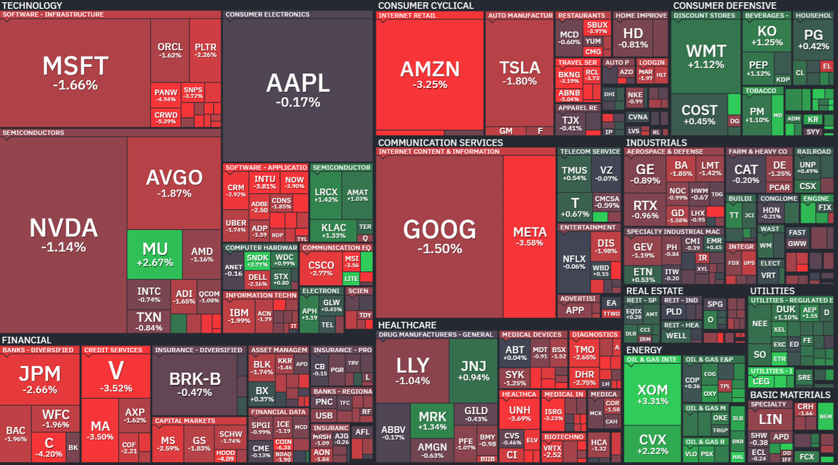 Ese comportamiento mixto no podía leerse al margen del contexto internacional, porque el mapa sectorial de Wall Street seguía pintado mayormente de rojo, con presión visible en tecnología, consumo discrecional y parte del segmento financiero, dado que Microsoft retrocedía 1,66%, Nvidia caía 1,14%, Amazon perdía 3,25%, Google cedía 1,5%, Meta se hundía 3,58%, JP Morgan bajaba 2,66% y Visa retrocedía 3,52%, de manera que la resistencia relativa mostrada por varios papeles argentinos adquiría un valor adicional, aunque todavía resultara prematuro interpretar ese desacople como un cambio estructural de tendencia.