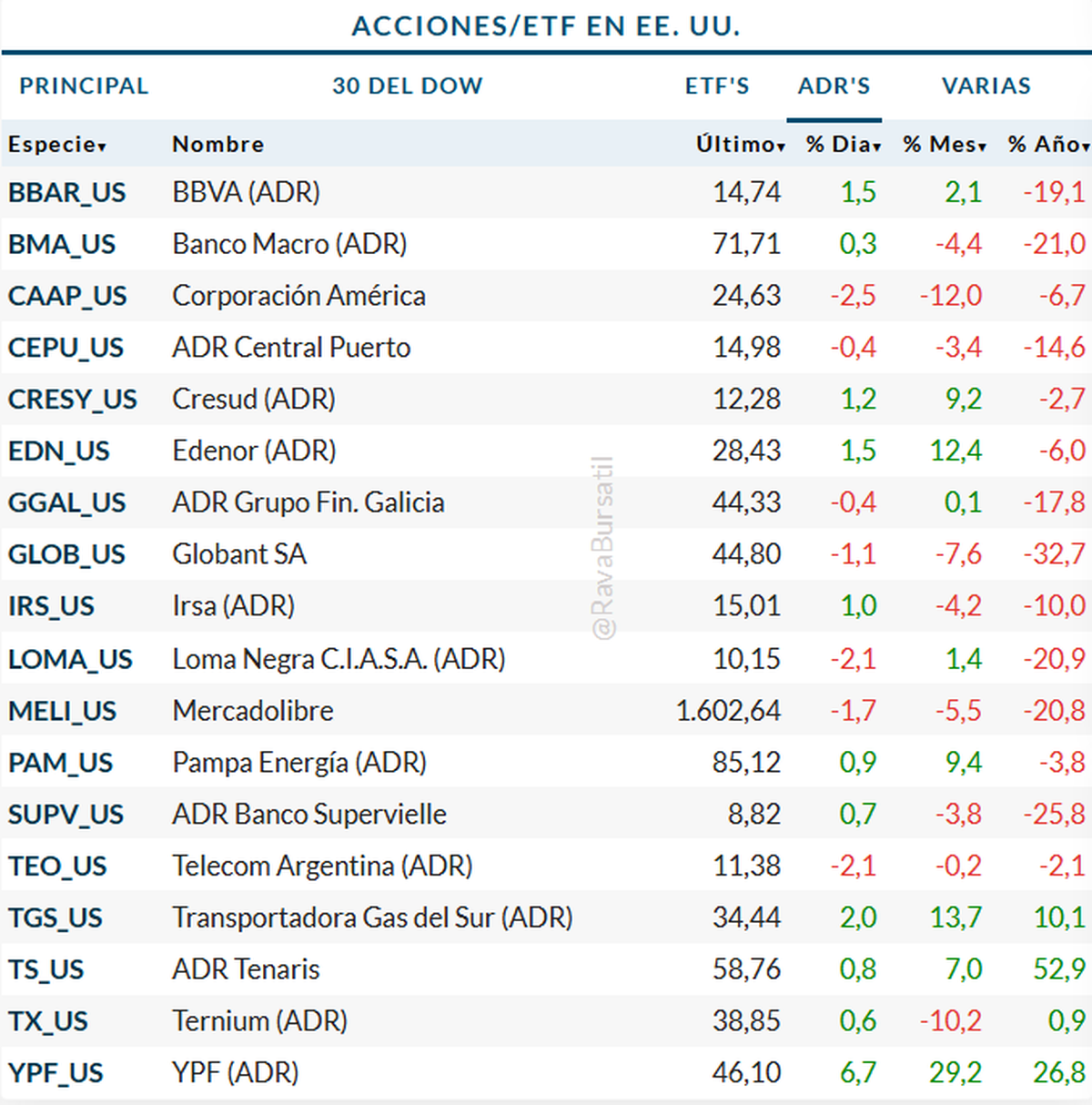 La rueda en Nueva York también dejaba una mejora en varios ADR argentinos, aunque con un comportamiento mucho menos lineal que el de la plaza porteña, ya que YPF encabezaba las alzas con 6,7%, seguida por TGS con 2%, BBAR y Edenor con 1,5%, Cresud con 1,2%, IRSA con 1%, Pampa con 0,9%, Tenaris con 0,8% y Supervielle con 0,7%, mientras que también persistían bajas relevantes en nombres como Mercado Libre, que perdía 1,7%, Telecom, que caía 2,1%, Loma Negra, que aflojaba 2,1%, y Corporación América, que retrocedía 2,5%.