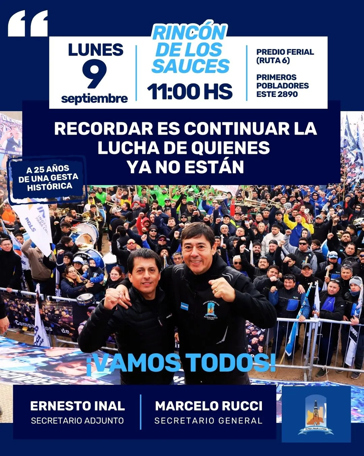 La asamblea de este lunes será en el Predio Ferial, Primeros Pobladores Este 2890, a la vera de la Ruta 6 en Rincón de los Sauces, y comienza a las 11 de la mañana.
