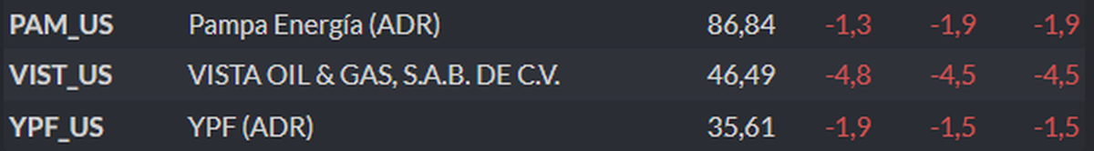 Con el mercado aun operando, Pampa Energía se mueve en torno a los US$86,8 con retrocesos cercanos al 2%, Vista profundiza la corrección y acumula pérdidas superiores al 4%, mientras que YPF cede alrededor de 1,5%. El denominador común es la reducción de exposición a riesgo latinoamericano en un día dominado por titulares geopolíticos.