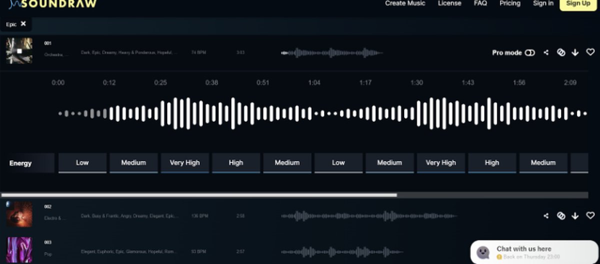 ¿Necesitas Música sin Copyright para algún anuncio de video? Entra a Soundraw y seleccioná el mood de lo que necesitás. Es una herramienta que genera música de siete géneros diferentes, ofreciendo variantes de los mismos según el estado de ánimo que se indique y el perfil que persigue el vídeo u obra en el que se pretenda darle uso.