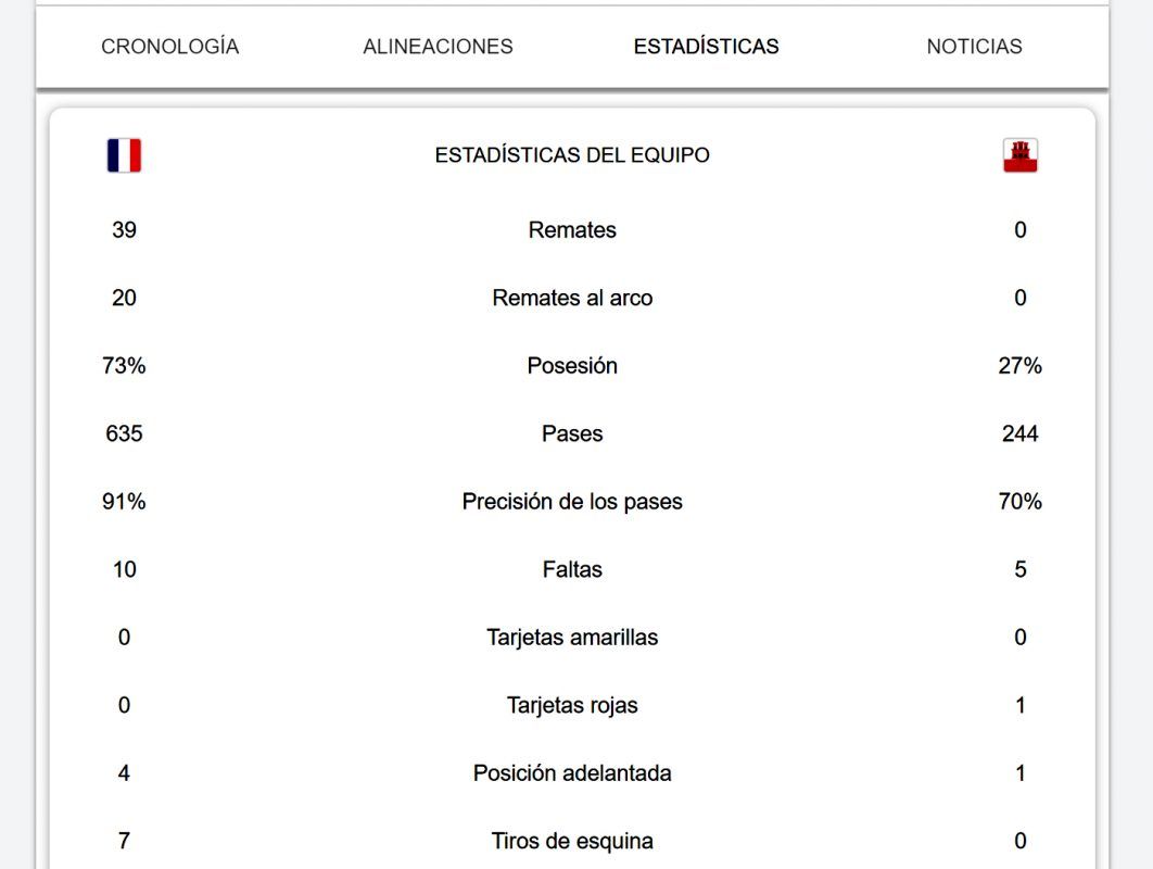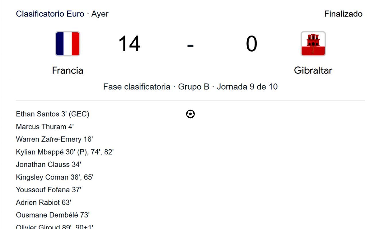 | Francia pulveriza 14-0 a Gibraltar y entra en la historia del fútbol rompiendo varios récords. Se trata de la mayor victoria del conjunto francés, así como la mayor goleada en la historia de las eliminatorias para la Eurocopa.