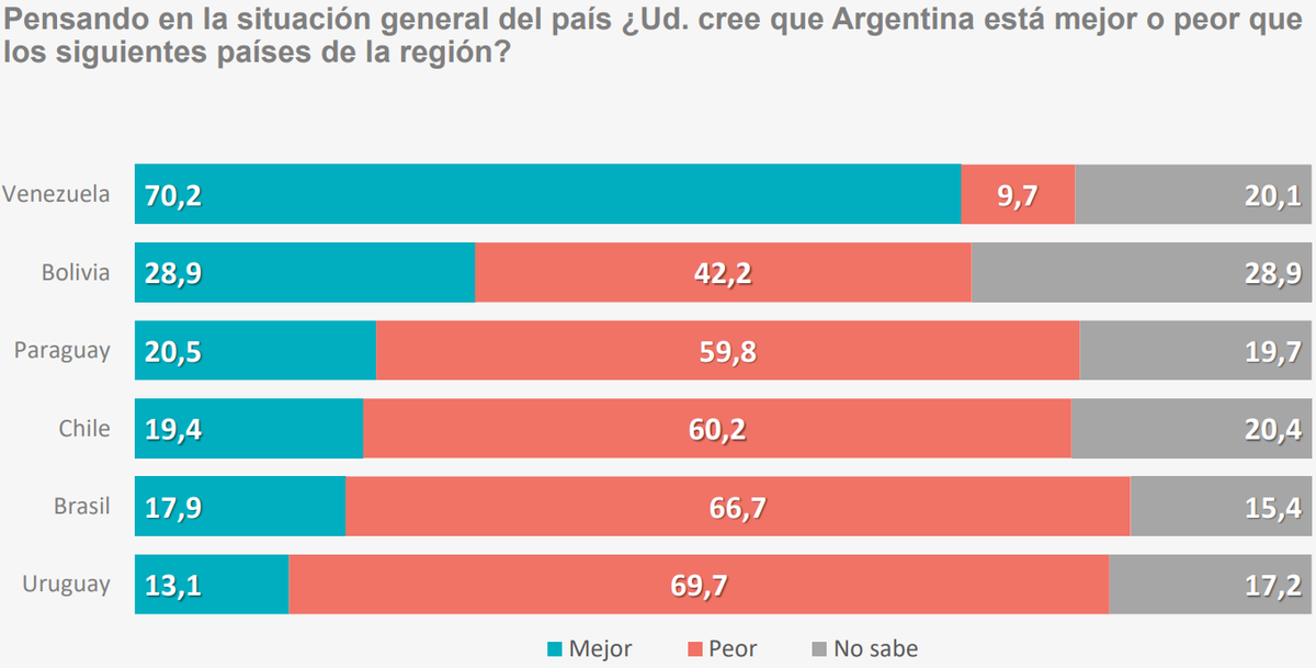 Un 24% de los argentinos considera que el triunfo de Lula Da Silva en Brasil aumenta las chances del peronismo de ganar las elecciones presidenciales en 2023. La mayoría de los encuestados considera que la situación del país es peor que la de Brasil (66,7%), Chile (60,2%), Uruguay (69,7%), Paraguay (59,8%) y Bolivia (42,2%) y coincide en que estamos mejor que Venezuela (70,2%).