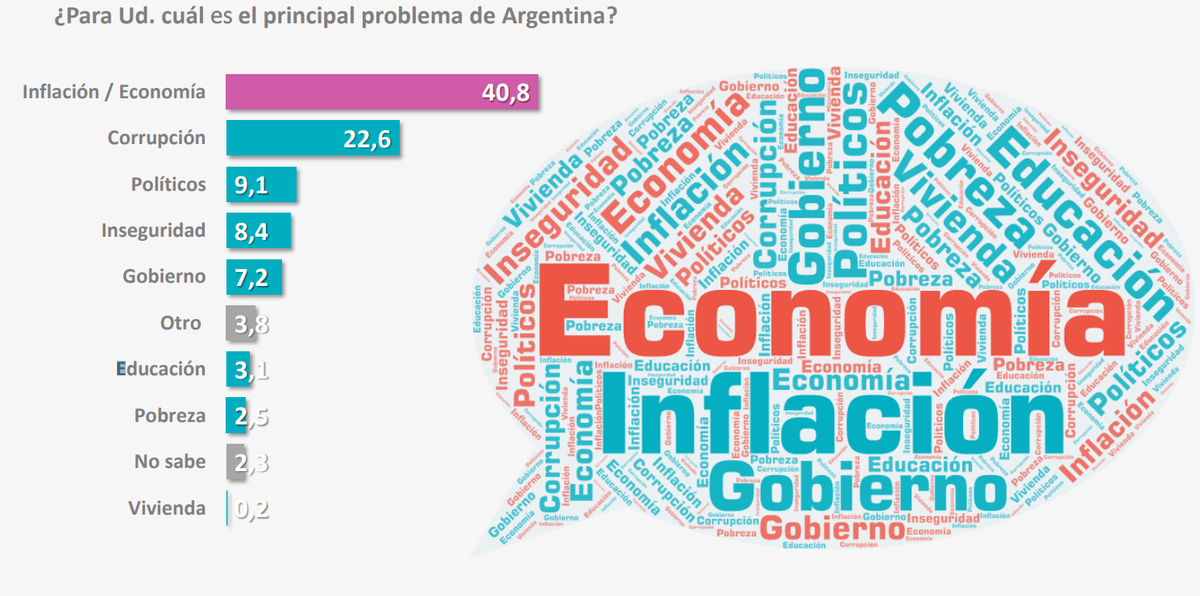 "Los argentinos consideran que los principales problemas que afronta nuestro país son la inflación y la economía. Le sigue en el ranking de problemáticas la corrupción, los políticos y la inseguridad.