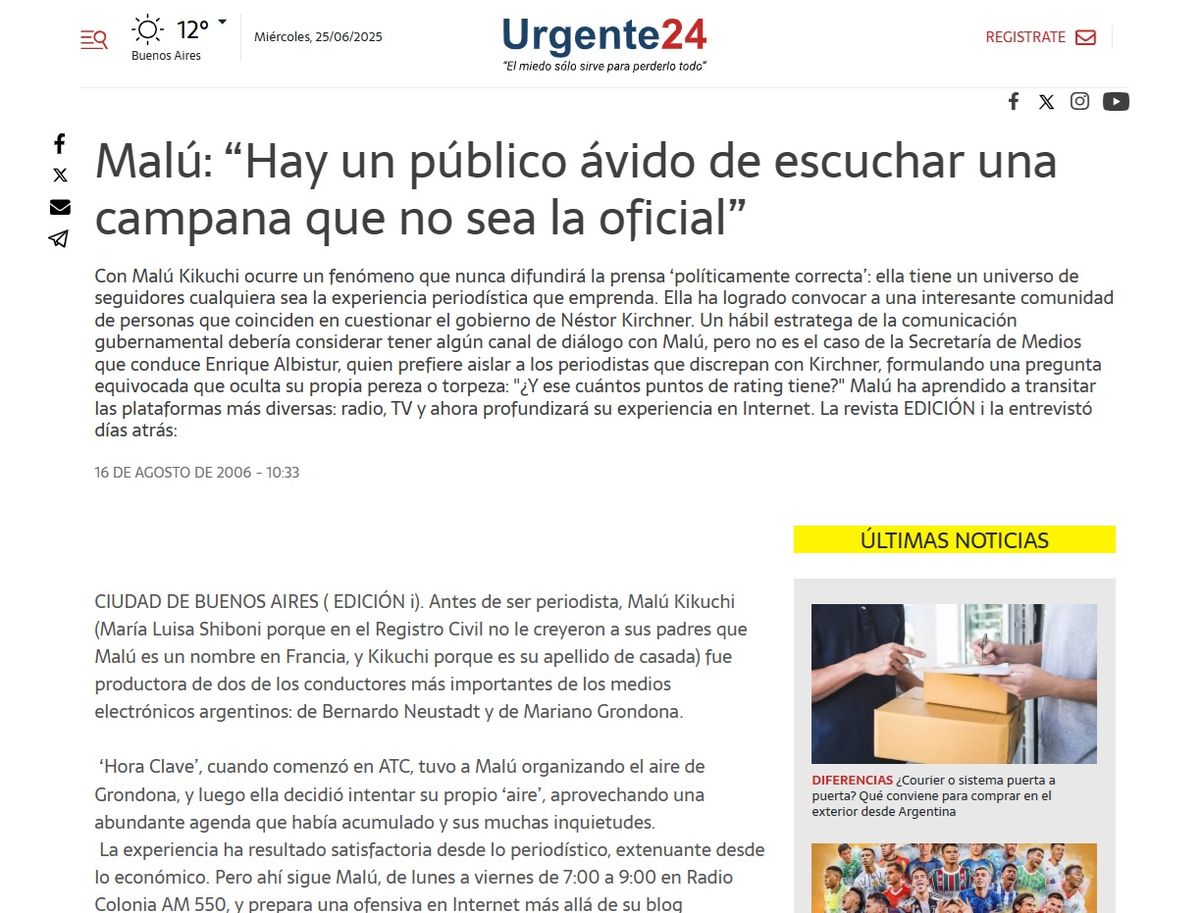 Con Malú Kikuchi ocurre un fenómeno que nunca difundirá la prensa ‘políticamente correcta’: ella tiene un universo de seguidores cualquiera sea la experiencia periodística que emprenda. Ella ha logrado convocar a una interesante comunidad de personas que coinciden en cuestionar el gobierno de Néstor Kirchner. Un hábil estratega de la comunicación gubernamental debería considerar tener algún canal de diálogo con Malú, pero no es el caso de la Secretaría de Medios que conduce Enrique Albistur, quien prefiere aislar a los periodistas que discrepan con Kirchner, formulando una pregunta equivocada que oculta su propia pereza o torpeza: "¿Y ese cuántos puntos de rating tiene?" Malú ha aprendido a transitar las plataformas más diversas: radio, TV y ahora profundizará su experiencia en Internet. La revista EDICIÓN i la entrevistó días atrás: