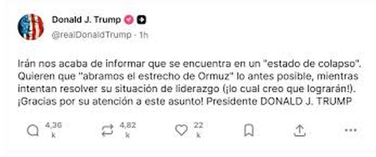 El presidente de Estados Unidos, Donald Trump, publicó este martes en su red Truth Social que "Irán está en un 'estado de colapso'" y que el régimen iraní le está pidiendo a la Casa Blanca que reabra inmediatamente el estrecho de Ormuz, por donde fluye una quinta parte del petróleo del mundo y que actualmente se encuentra bajo un bloqueo estadounidense y en medio del fuego cruzado de Washington y Teherán en el marco de una frágil tregua y el estancamiento de las negociaciones.