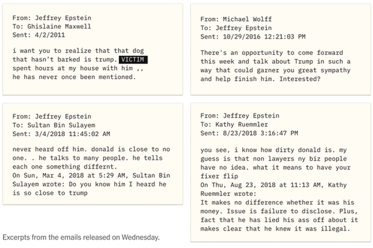 Los demócratas del Comité de Supervisión de la Cámara de Representantes publicaron más de 20.000 correspondencias entre Jeffrey Epstein —quien murió en su celda mientras enfrentaba un juicio por abuso sexual y trata de menores—, su socia Ghislaine Maxwell —quien cumple una condena de veinte años de prisión por tráfico de menores—, y el periodista Michael Wolff, quien ha escrito numerosos libros biográficos sobre Donald Trump.
