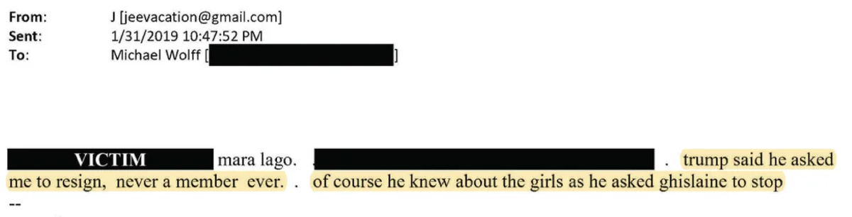 En uno de los correos electrónicos, Epstein le escribió a Wolff aparentemente para abordar las afirmaciones de Trump de que le pidió a Epstein que renunciara a su membresía en el club Mar-a-Lago.