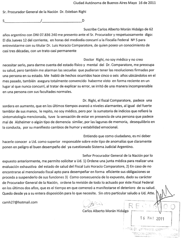 Suscribe Carlos Alberto Morán Hidalgo, de 62 años, argentino, con DNI 07.836.240. Me presento ante el Sr. Procurador y, respetuosamente, digo: el día jueves 12 del corriente, en horas del mediodía, concurrí a la Fiscalía Federal Número 5, para entrevistarme con su titular, el Dr. Luis Horacio Comparatore, de cuya tarea poseo un conocimiento de casi tres décadas, con un trato que ha sido casi permanente.