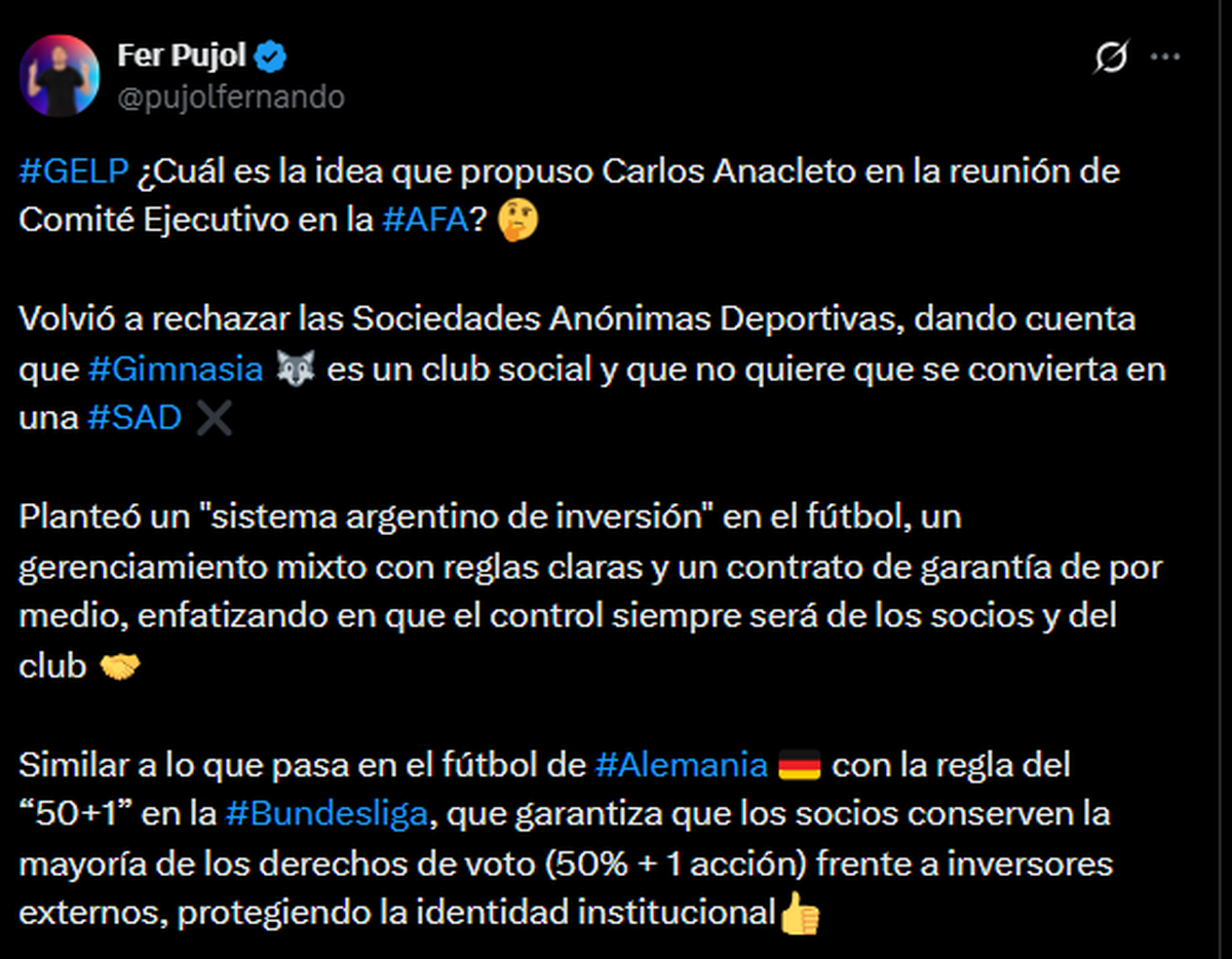 El presidente del conjunto de La Plata, habría hecho foco en que la administración de los clubes seguiría siendo de sus socios y que estos seguirían siendo clubes con rol social y asociaciones sin fines de lucro. Incluso, Anacleto habría hecho foco claro en su rechazo a la figura SAD.