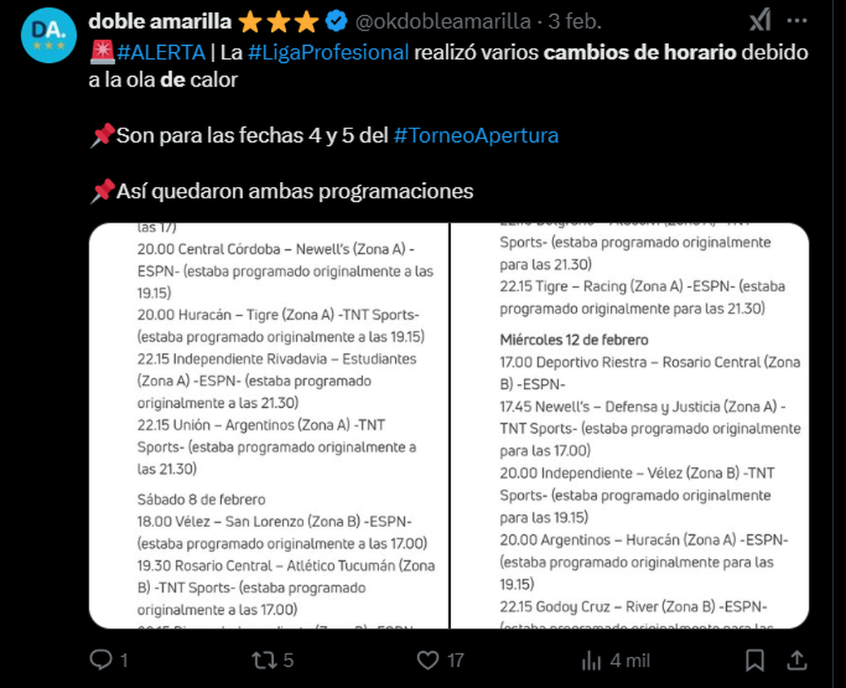 En Argentina hace mucho calor y por las altas temperaturas desde la AFA de Chiqui Tapia se decidió cambiar los horarios de los partidos del Apertura 2025. Esto generó algunas burlas y hasta en algunos casos indignación por la rareza en las diferentes modificaciones.