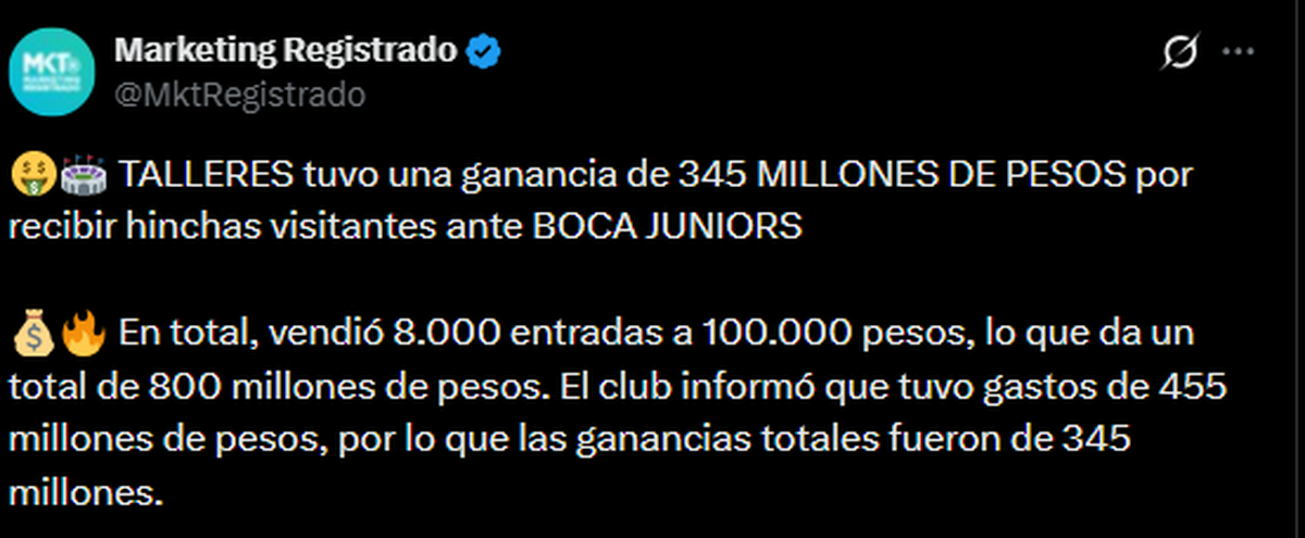 En este contexto, el medio Marketing Registrado dio a conocer las ganancias obtenidas por el Matador a partir de esta disposición. A través de sus redes sociales, informó: “Talleres tuvo una ganancia de 345 millones de pesos por recibir hinchas visitantes ante Boca Juniors. En total, vendió 8.000 entradas a 100.000 pesos, lo que da un total de 800 millones de pesos. El club informó que tuvo gastos de 455 millones de pesos, por lo que las ganancias netas fueron de 345 millones.”