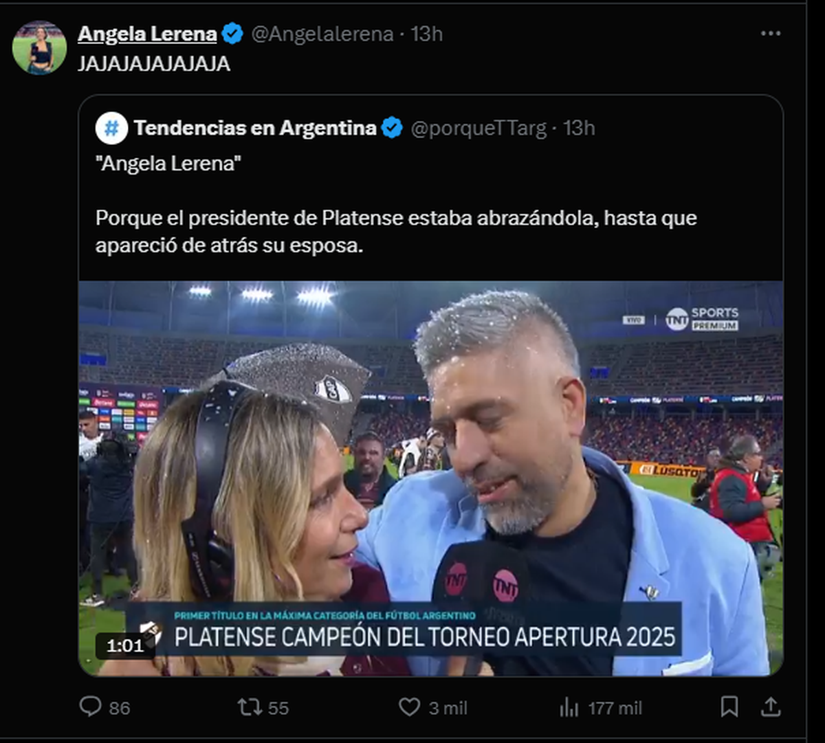 Una de las tantas páginas de tendencias que hay en X, publicó: "´Angela Lerena´. Porque el presidente de Platense estaba abrazándola, hasta que apareció de atrás su esposa.".