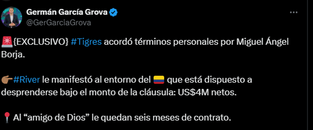 Uno de los que habló al respecto, fue Germán García Grova, uno de los periodistas que más información tiene en cuanto a mercado de pases en Argentina. "Tigres acordó términos personales por Miguel Ángel Borja. River le manifestó al entorno del que está dispuesto a desprenderse bajo el monto de la cláusula: US$4M netos. Al ´amigo de Dios´ le quedan seis meses de contrato."