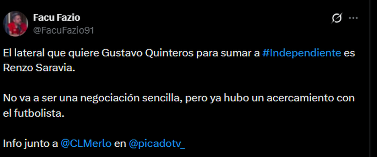 Según informó el periodista, el lateral derecho que pretende Gustavo Quinteros es Renzo Saravia. De acuerdo a lo revelado en Picado TV, ya existió un acercamiento informal con el futbolista, que a sus 32 años se encuentra libre tras su paso por Atlético Mineiro.
