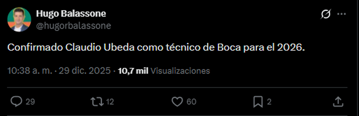 Finalmente, este lunes 29 de diciembre, el periodista Hugo Balassone confirmó la situación a través de su cuenta de X: “Confirmado Claudio Úbeda como técnico de Boca para 2026”.