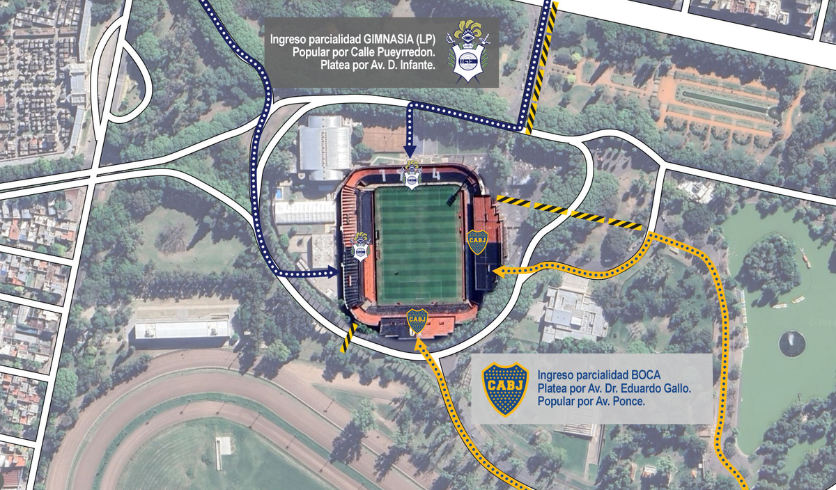 En cambio, para los simpatizantes de Gimnasia, el organismo dispuso que deberán partir desde la Ruta N° 215 (Avenida 44) hasta unirse con la Ruta N° 6. Posteriormente, la Ruta N° 8 hasta Pergamino, siguiendo por la Ruta N° 32 para chocarse con el límite interprovincial de la provincia de Santa Fe.
