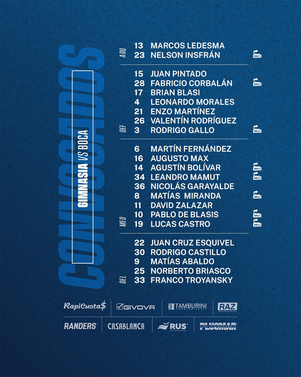 Gimnasia: Marcos Ledesma; Juan Pintado, Leo Morales, Enzo Martínez, Rodrigo Gallo o Valentín Rodríguez; Lucas Castro, Martín Fernández, Nicolás Garayalde o Augusto Max; Matías Abaldo, Rodrigo Castillo y Norberto Briasco. DT: Marcelo Méndez.