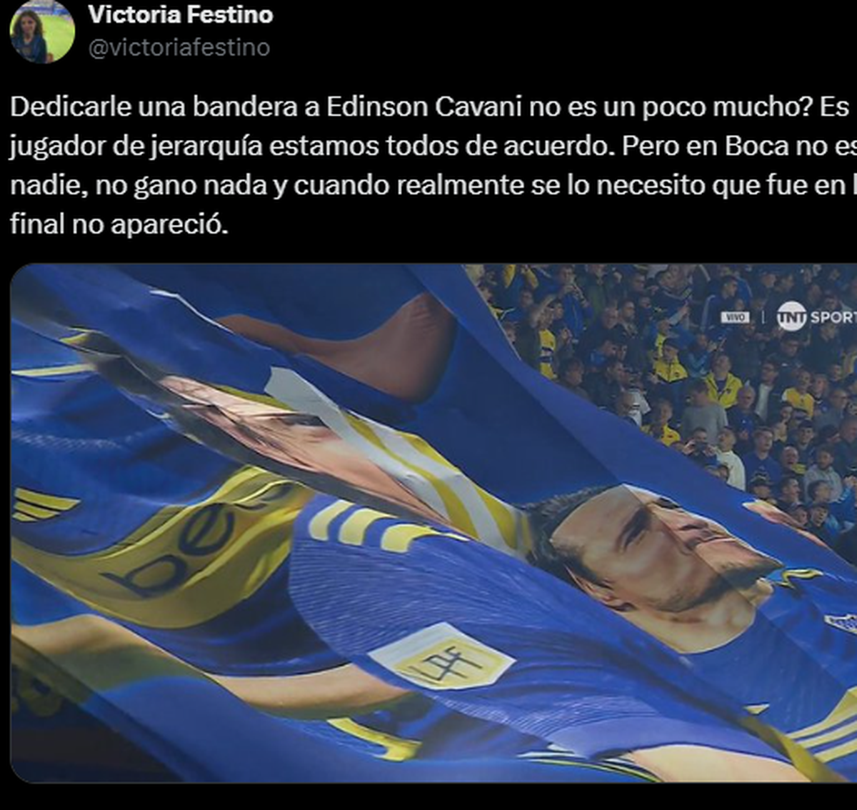 La semana pasada, Cavani renovó si vínculo con el Xeneize. Será jugador de Boca hasta diciembre de 2026 y por tal motivo fue el despliegue de la bandera por parte de la parcialidad. Tras terminar el partido ante Argentinos Juniors, el uruguayo declaró: “Me voy a retirar en Boca. Siempre dije que quería volver cerca de mi casa cuando estuviera bien para jugar”. Y luego completó: “He vivido en lo que va de estos 14 meses cosas increíbles con este club. Y las ganas de lograr cosas, ganar cosas acá, están intactas. Gracias por todo lo que me dan."