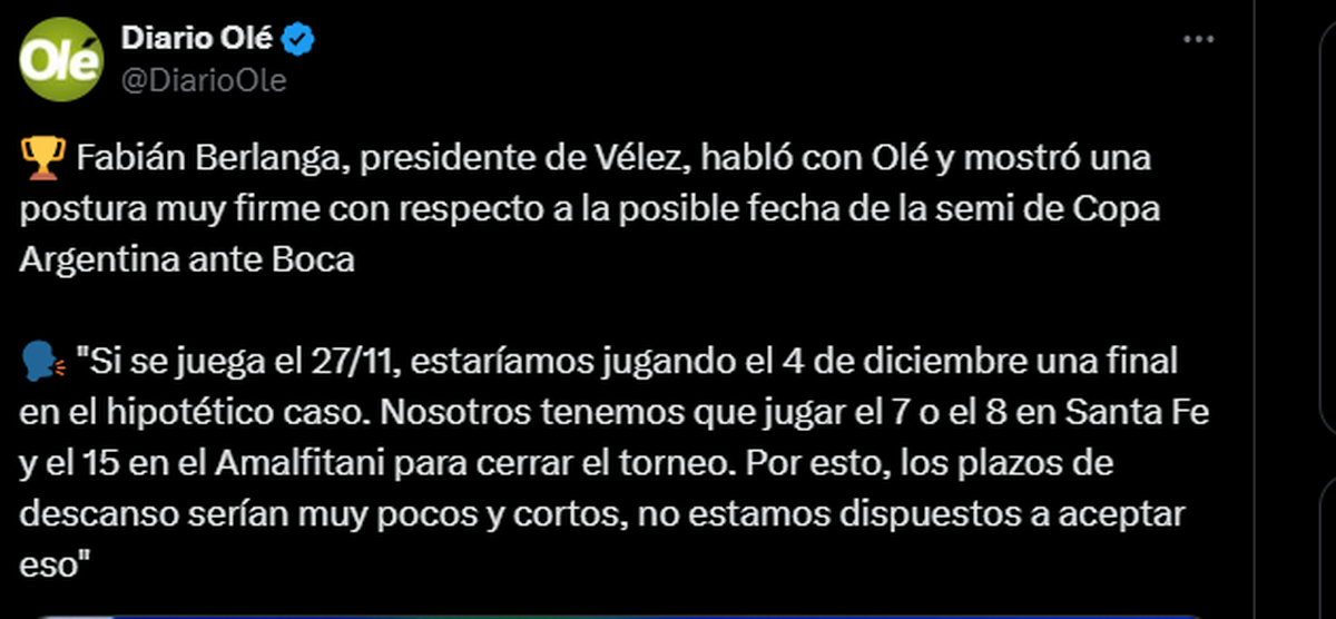 El enojo del Fortín (con Fabián Berlanga a la cabeza), radica en que si se juega el 27/11, faltarían 3 fechas para que finalice la Liga Profesional, donde Vélez está puntero.