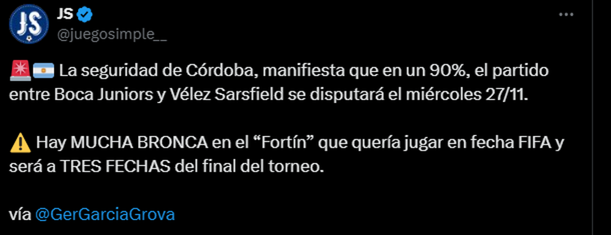 Todo indica que la fecha sería el 27/11 según confirmó García Grova y la seguridad de Córdoba. De igual manera, en caso de perder, podría ser perjudical también para Boca ya que necesitaría ganar si o si las últimas fechas del torneo local para clasificar a la Libertadores. Se sobreentiende, que sería difícil también para el Xeneize no contar con jugadores del plantel en fecha FIFA. De ahí radicaría el pedido para el 27/11.