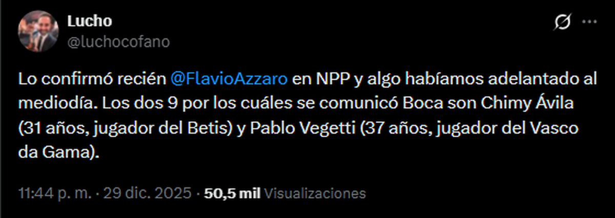 El periodista Luciano Cofano confirmó a través de X: “Los dos ‘9’ por los cuales se comunicó Boca son Chimy Ávila (31 años, jugador del Betis) y Pablo Vegetti (37 años, futbolista del Vasco da Gama)”.