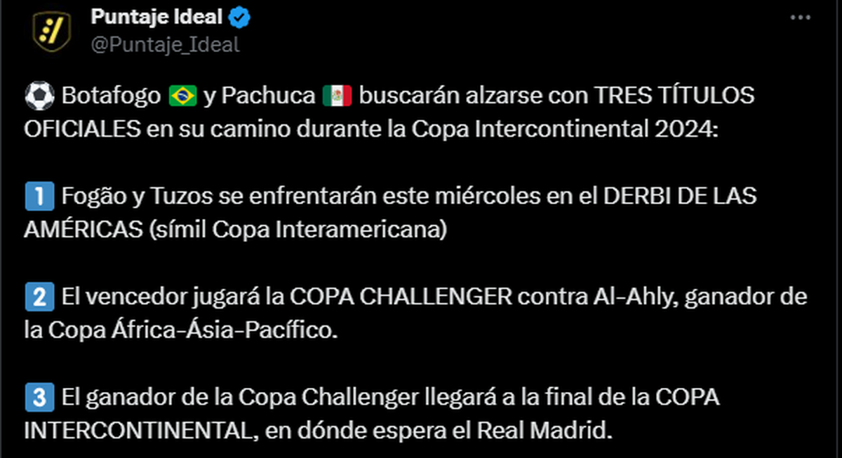 Por último, si Pachuca o Botafogo logran llegar a la final, se cruzarán ante el Real Madrid por la Copa Intercontinental. Si, 3 copas internacionales en el transcurso de 7 días.