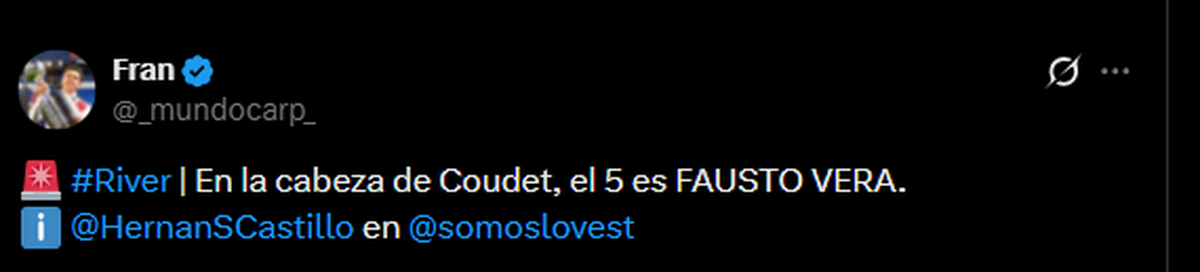 En la zona central del campo apareció un dato llamativo. El periodista Hernán Castillo aseguró que, para el nuevo entrenador, el “5” es Fausto Vera. De confirmarse, será interesante ver qué rol ocupará Aníbal Moreno, quien llegó en el último mercado de pases y se convirtió en una pieza importante en el arranque de año bajo la conducción de Marcelo Gallardo.