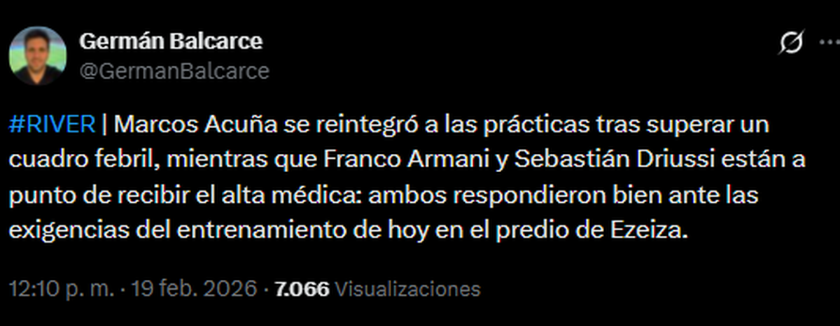 Por su parte, el también periodista partidario Germán Balcarce amplió el panorama: “Franco Armani y Sebastián Driussi están a punto de recibir el alta médica: ambos respondieron bien ante las exigencias”.