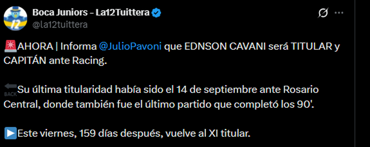 En este contexto, el periodista Julio Pavoni, junto a otros comunicadores partidarios, aseguró que Edinson Cavani será titular y capitán ante Racing. El equipo volvería al 4-4-2, ya que su acompañante en el ataque sería Miguel Merentiel.
