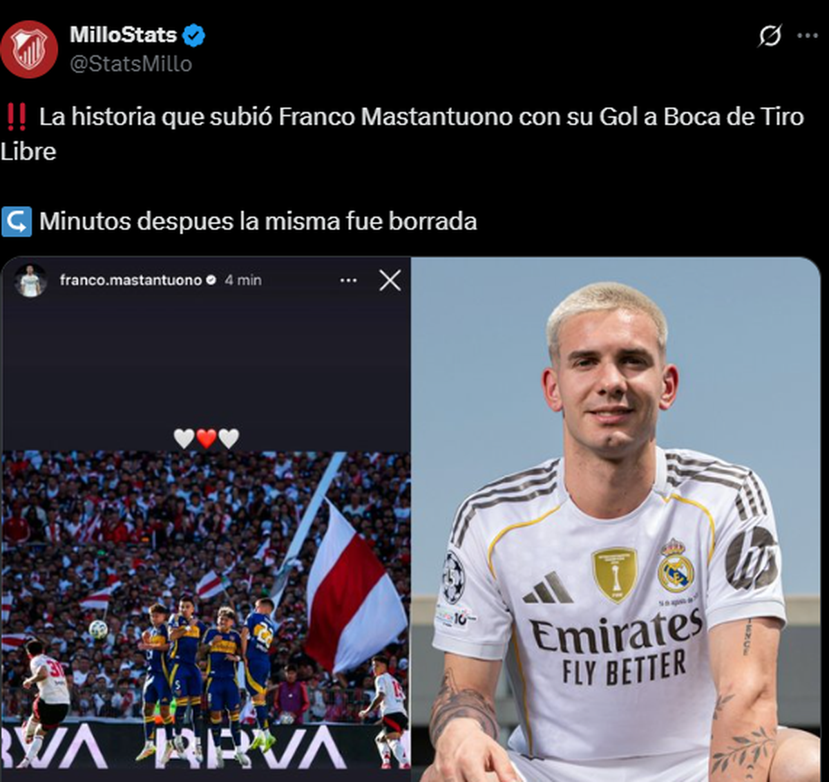 El pib que hoy es futbolista de Real Madrid, publicó una storie en Instagram de una foto en donde se lo ve a él pateando la pelota en el último Superclásico disputado en el Monumental.