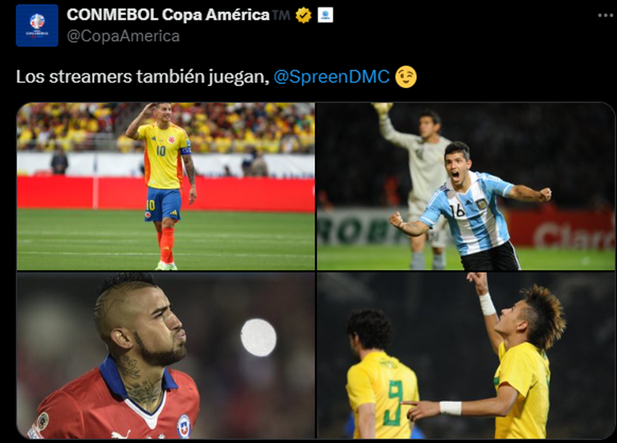 "Los streamers también juegan @SpreenDMC" y fotos de Kun Aguero, James Rodríguez, Arturo Vidal y Neymar, fue lo que subió Conmebol Copa América (con descripción: "Cuenta oficial del torneo de selecciones más antiguo del mundo")