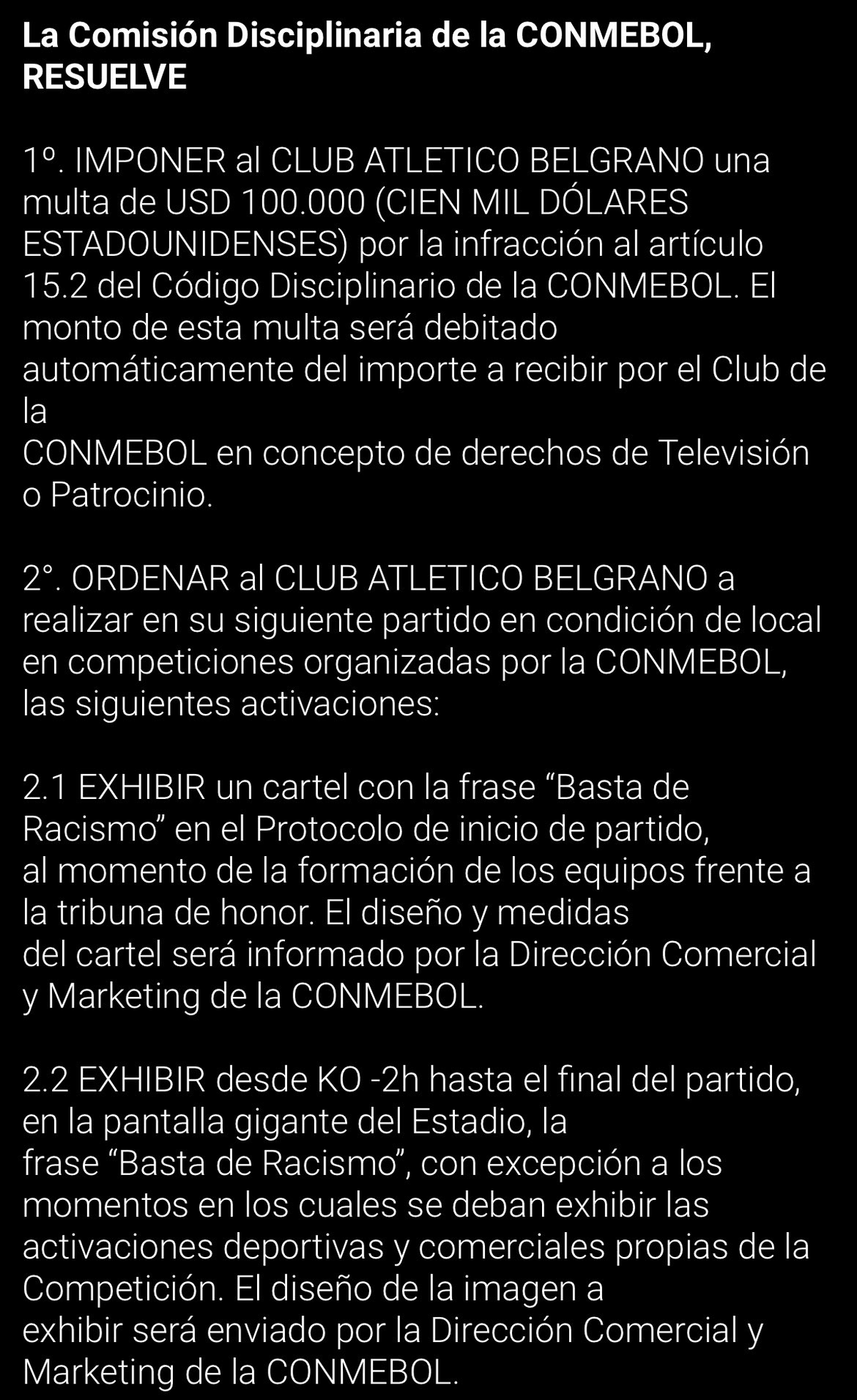 1°. IMPONER al CLUB ATLETICO BELGRANO una multa de USD 100.000 (CIEN MIL DÓLARES ESTADOUNIDENSES) por la infracción al artículo 15.2 del Código Disciplinario de la CONMEBOL. EI monto de esta multa será debitado automáticamente del importe a recibir por el Club de la CONMEBOL en concepto de derechos de Televisión o Patrocinio.