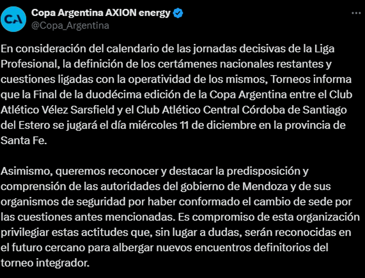 En consideración del calendario de las jornadas decisivas de la Liga Profesional, la definición de los certámenes nacionales restantes y cuestiones ligadas con la operatividad de los mismos, Torneos informa que la Final de la duodécima edición de la Copa Argentina entre el Club Atlético Vélez Sarsfield y el Club Atlético Central Córdoba de Santiago del Estero se jugará el día miércoles 11 de diciembre en la provincia de Santa Fe.